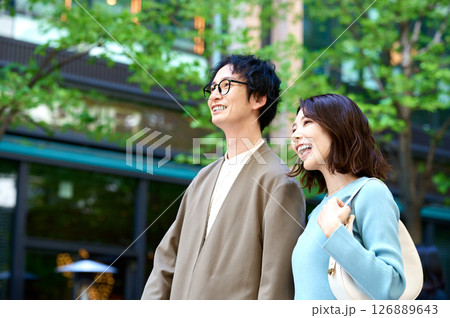 街を歩く笑顔の30代の男女