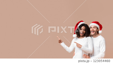Seasonal Sales. Excited millennial couple pointing aside at free space for your advertisement over yellow background, panorama