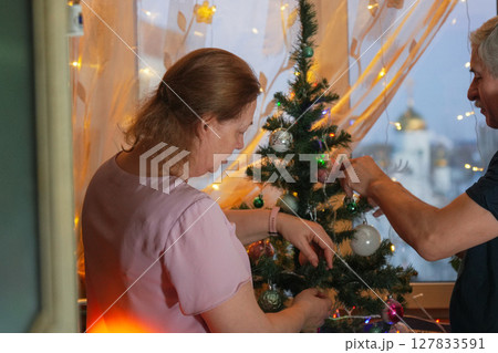 Couple shares joyful moments indoors as they decorate a Christmas tree with colorful ornaments and lights