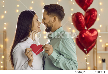Young attractive happy couple in love in romantic atmosphere holds red heart.