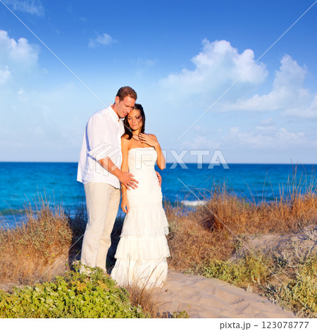 Portrait of beautiful bride and an elegant groom in nature, surrounded by a forest.