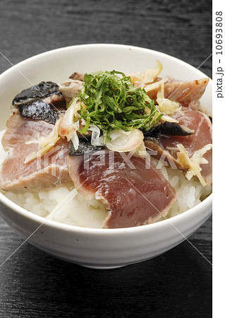 白い丼に盛り付けられた鰹のたたき丼 写真素材