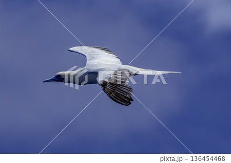 青空を飛翔し、魚を狙うカツオドリ