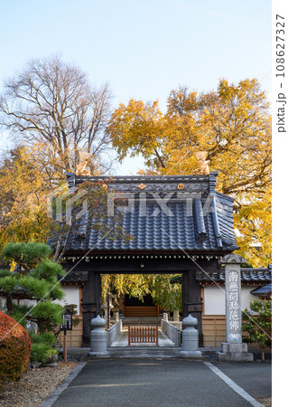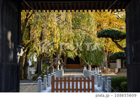 門越しに見る枝垂桜と桂の黄葉 岩手県盛岡市 円光寺