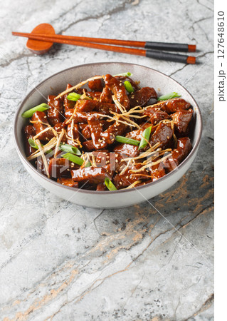 Ginger beef with crispy beef, a lightly sweet sauce, green onion and caramelized ginger closeup in the bowl. Vertical