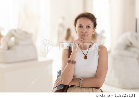Portrait of woman visitor with smartphone in hands looking exhibition of statues in museum
