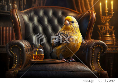 portrait of canary on an expensive leather armchair with whiskey in his hands near the fireplace, generative ai