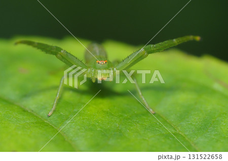 生き物 蜘蛛 アマギエビスグモ、カニグモの仲間の小さなクモ。腕(?)を広げて待ち伏せ中