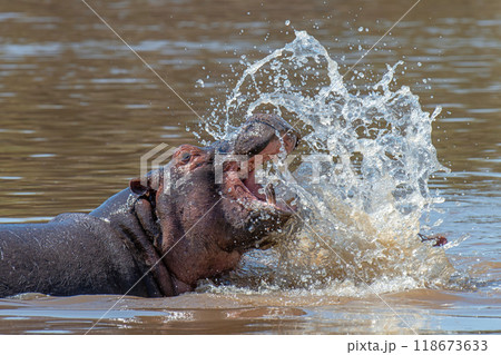「迫力満点のカバの威嚇シーン - 水しぶきを上げながら大きな口を開く巨体の力強さ」