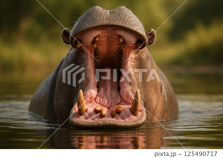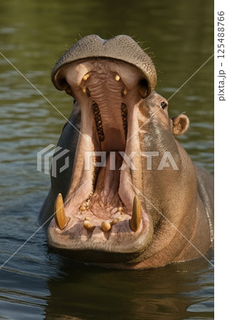 迫力あるカバの威嚇シーン - 巨大な体と牙を見せつける水辺の王者の堂々たる姿