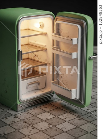 汚れたレトロ冷蔵庫の内部 開いた扉とカビ・サビの質感
