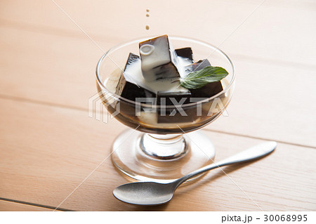 ガラスの器に盛り付けた冷たいコーヒーゼリーとコーヒー豆 自然光