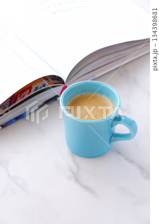 朝のひと時、お気に入りのマグカップに淹れたての美味しいコーヒーを入れて、ひと休みしているイメージ