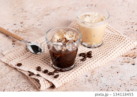Iced coffee and black coffee served in clear glasses on beige stone table