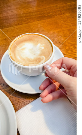 Female hand with silver manicure holding a white cup of hot cappuccino with latte art in a cafe
