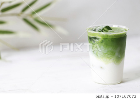 Matcha, green tea latte in a cup. Grey stone background. Top view. Copy space.