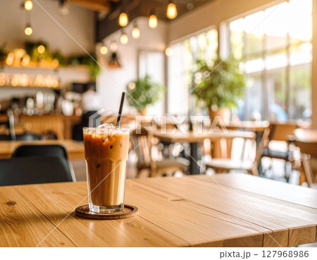 Cup of chilled milk dirty coffee on table by the window. Selective focus.