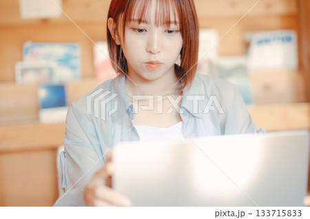 コワーキングスペースで作業をする20代女性のワークシーン