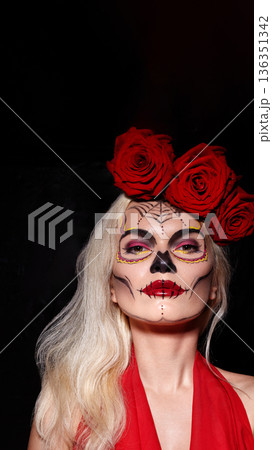Blonde Caucasian Woman Sugar Skull Portrait Wearing Crimson Rose Crown And Red Velvet Dress, Dramatic Facepaint With Purple Eye Accents, Black Nose Detail, Dotted Embellishments And Rhinestones,