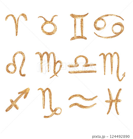 Set of gold glitter zodiac signs and symbols. Horoscope, astrology. Twelve constellations isolated