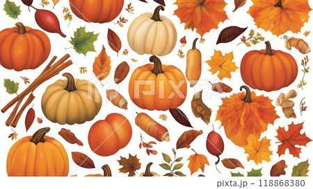Vector hand drawn Halloween seamless pattern with fall leaves and pumpkins.