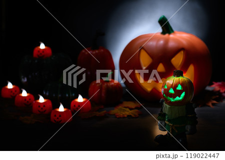 ハロウィン 微笑む豆柴とイルミネーションとキャンドルとカボチャ