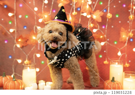 ハロウィン 微笑むトイプードルとイルミネーションとキャンドルとカボチャ