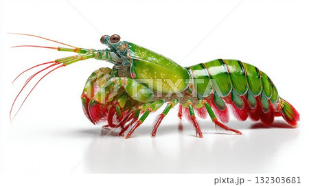 Vibrant green mantis shrimp with red accents isolated on white background showing detailed colorful exoskeleton and anatomical features