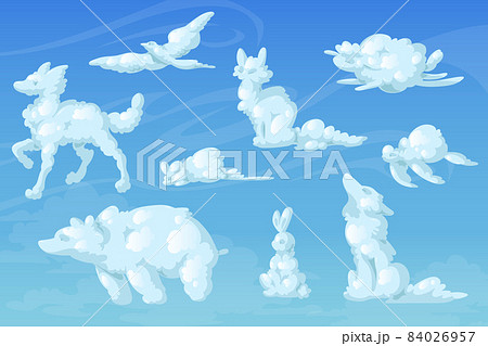 Marine animals and aquatic life set funny imagination stingray, ray, dolphin, turtle, seahorse, starfish, shark, bubble from Cloud or smoke patterns illustration isolated floating blue sky background