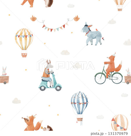 Seamless watercolor kids pattern with animals, balloons and hot air balloons. Cute hand painted nursery design for fabric, wallpaper and wrapping paper