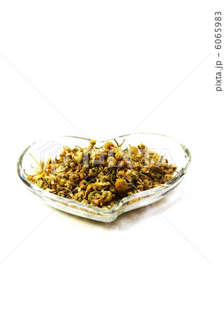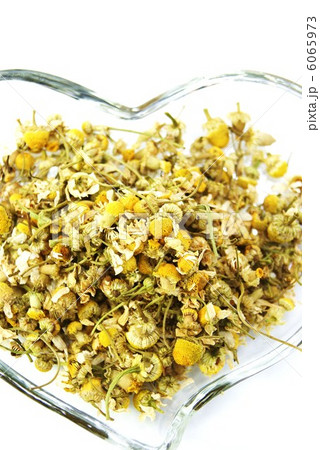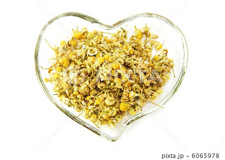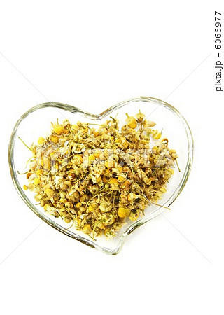 健康食品・ハート型透明皿にカモミール花茶・俯瞰引き横位置