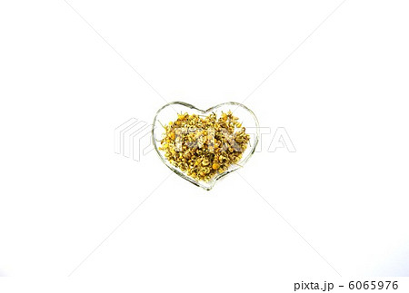 健康食品・ハート型透明皿にカモミール花茶・俯瞰横位置