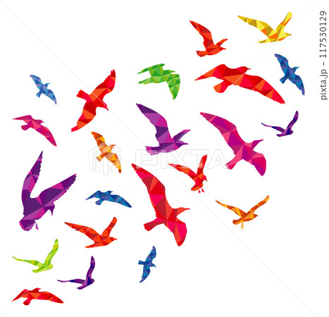 Flying bird flock silhouettes with color polygonal pattern