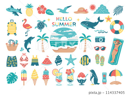 夏・海のイラストセット 南国 旅行 アイコン ビーチ 装飾
