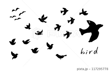 ミニマルな鳥のシルエットイラスト|飛ぶ鳥と群れのシンプルデザイン、手描き、ベクター素材