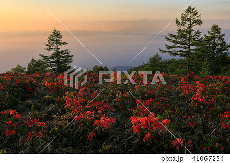 夜明けの甘利山のレンゲツツジとカラ松に富士山