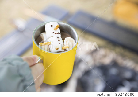 アウトドアイメージ マシュマロ入りココアを持つ子供手元