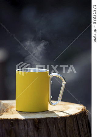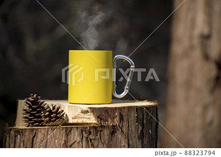 屋外で温かい飲み物を飲む女性手元 アウトドア キャンプイメージ