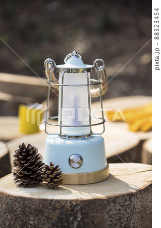 切り株の上に置かれたカラビナマグ アウトドア、キャンプイメージ