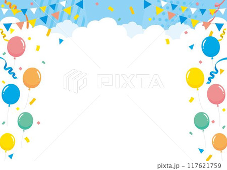 青空と紙吹雪と風船とガーランドの背景 雲上ver サイズ比率4:3
