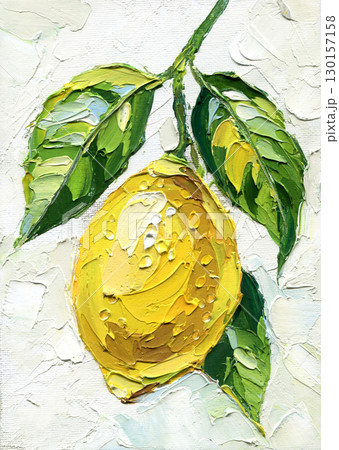 lemon impasto painting with green leaves textured oil artwork bright yellow citrus fruit still life wall decor kitchen art canvas