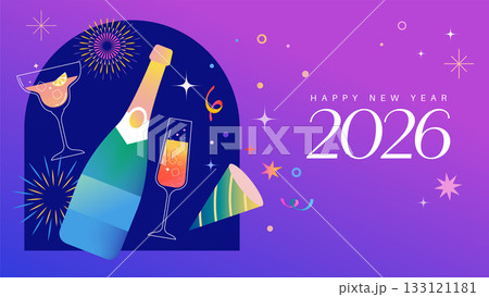 Happy New Year 2026 background with champagne and fireworks