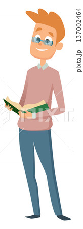 Reading man in glasses. Cartoon character with book in hands