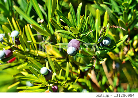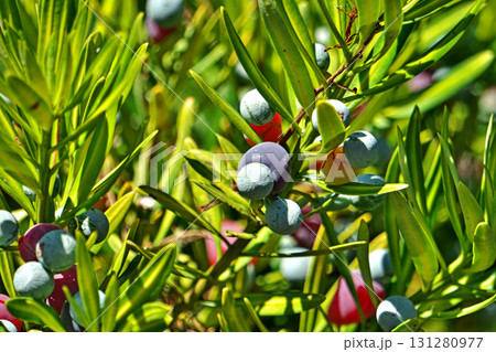 カラフルな色のラカンマキの実(秋、九月)