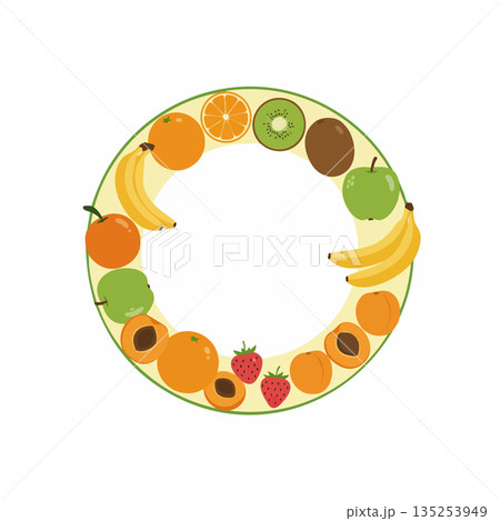 Circular arrangement of various fresh fruits including bananas oranges strawberries and kiwi vector illustration
