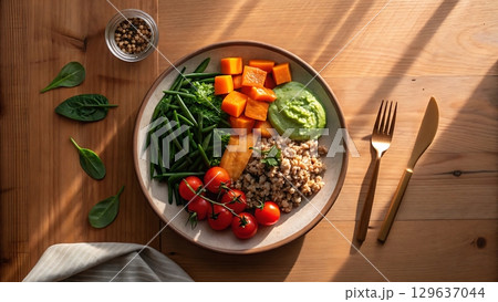 Overhead view of a colorful vegetable bowl with fork and knife on a wooden surface