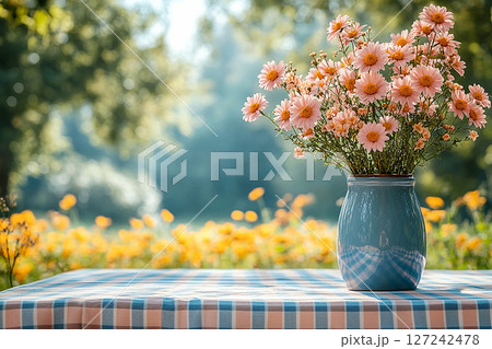 Picnic table with checkered tablecloth and a vase with flowers on a summer background. Retro-style. Mockup. Copy space.