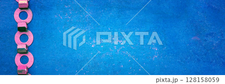 Abstract grunge blue metallic background from extended nuts and washers. Horizontal banner