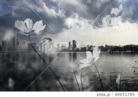 西梅田ビル街カラーとコスモスモノクロ多重露出撮影
