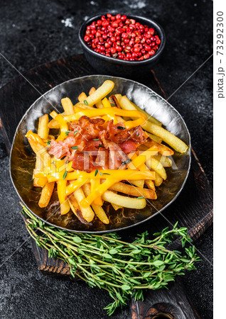 Delicious golden French fries with melted cheddar cheese and bacon. Black background. Top view